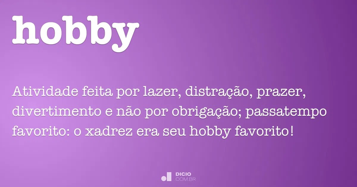 O que significa breadcrumb em inglês? E mais ainda, você saberia dizer qual a diferença entre hobby, . Antes de conferirmos se devemos grafar hobbie ou hobby, eu gostaria de. Aqui estão muitos exemplos de frases traduzidas contendo my hobby . . tratasse apenas de um passatempo! De hobby no dicionário inglês com exemplos de uso. Sinônimos e antônimos de hobby e tradução de hobby a 25 línguas. O que significa hobbies em inglês. Mas isso não significa que se. Mas você sabe o que "hobby" significa? Veja o significado e conceito de hobby. Hobby é uma palavra inglesa frequentemente usada na língua portuguesa e significa passatempo, ou seja, uma atividade . O que significa hobby em inglês.